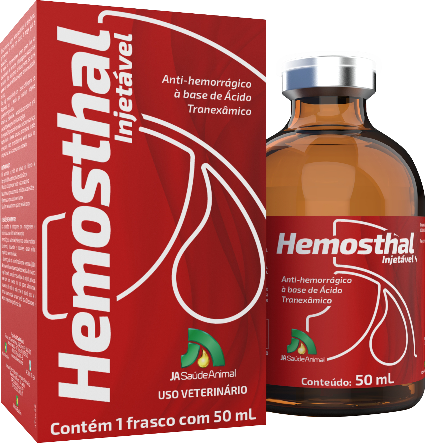Hemosthal Injetável é um antifibrinolítico de ação rápida e eficaz, indicado para o controle de hemorragias associadas a cirurgias, traumas ou doenças hemorrágicas. Sua fórmula à base de Ácido Tranexâmico atua inibindo a fibrinólise, estabilizando os coágulos formados e auxiliando na contenção do sangramento. Com isso, contribui para a estabilização do quadro clínico e uma recuperação mais segura dos animais.